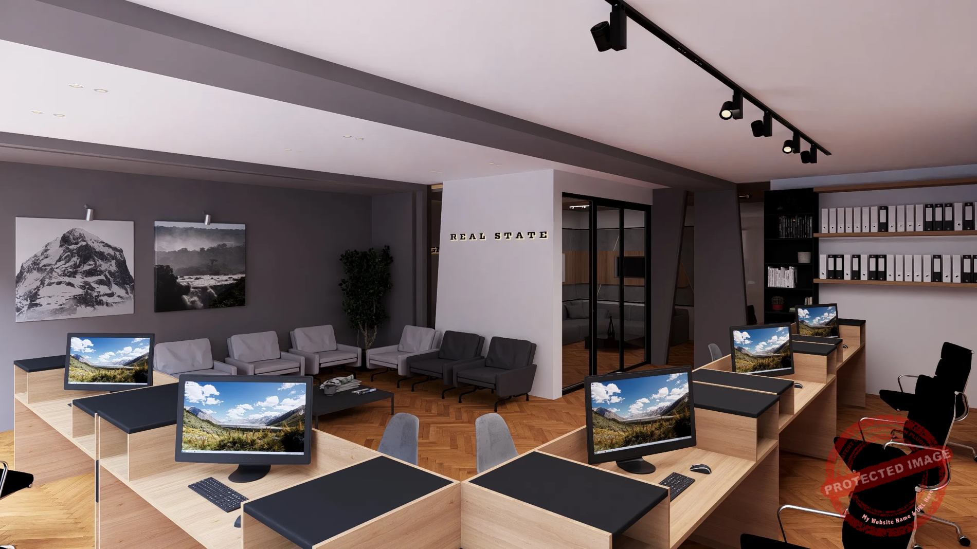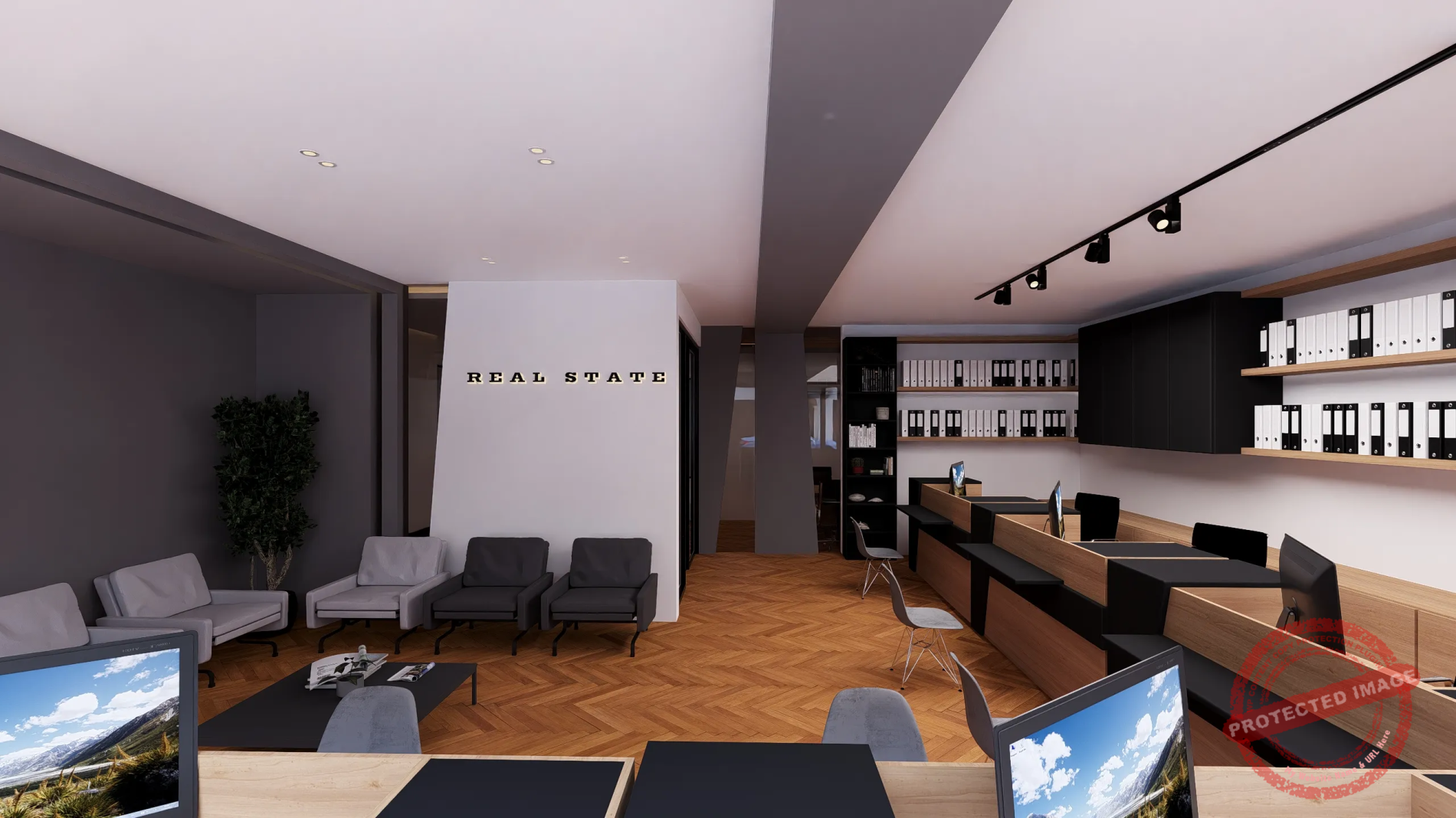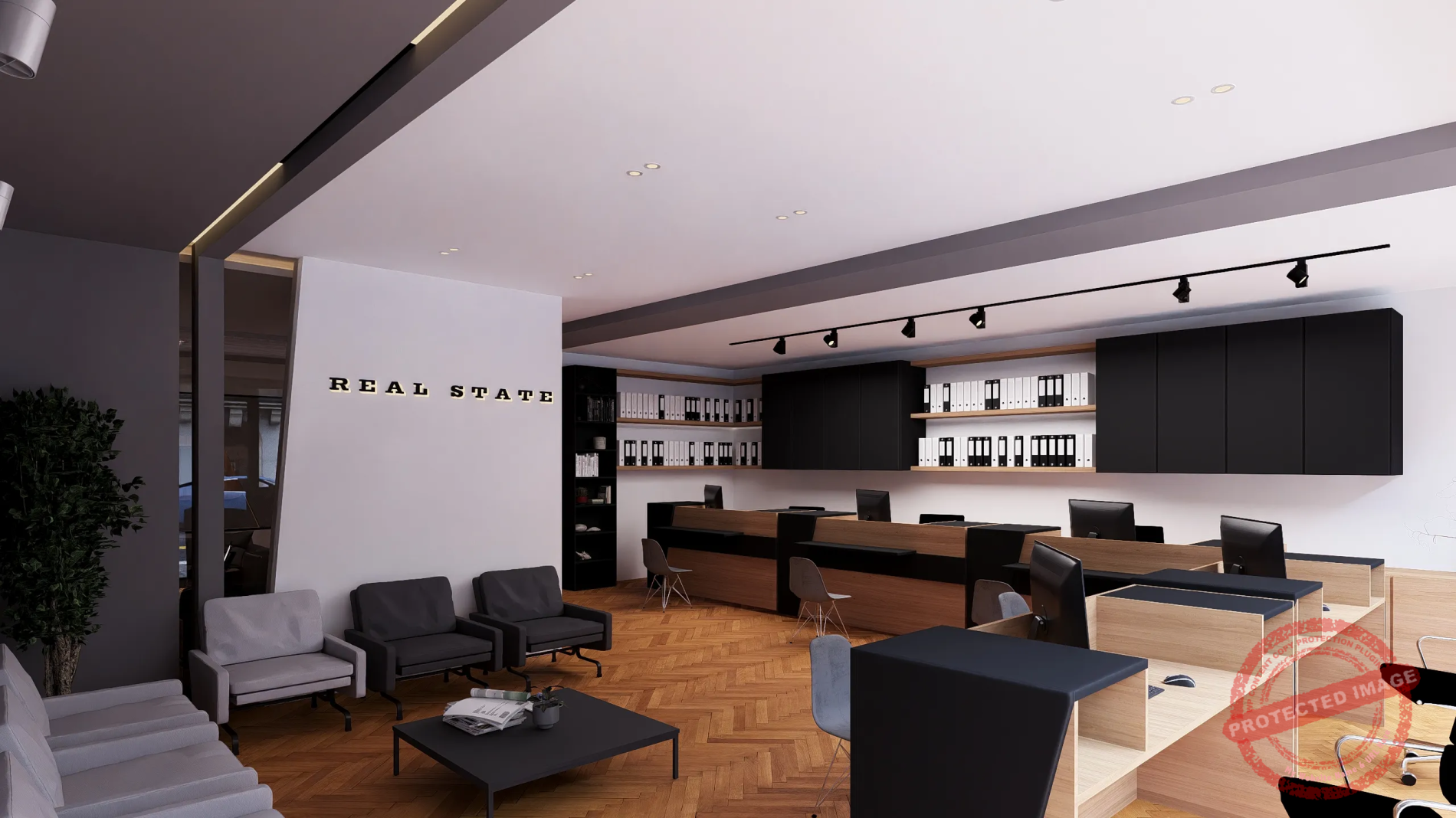 پروژه مذکور طراحی داخلی یک مشاور املاک با سبک مینیمال و مدرن بوده که طبق نظر کارفرما بخش ریاست و اتاق جلسات کاملا از فضای فروش و انتظار تفکیک شده است.