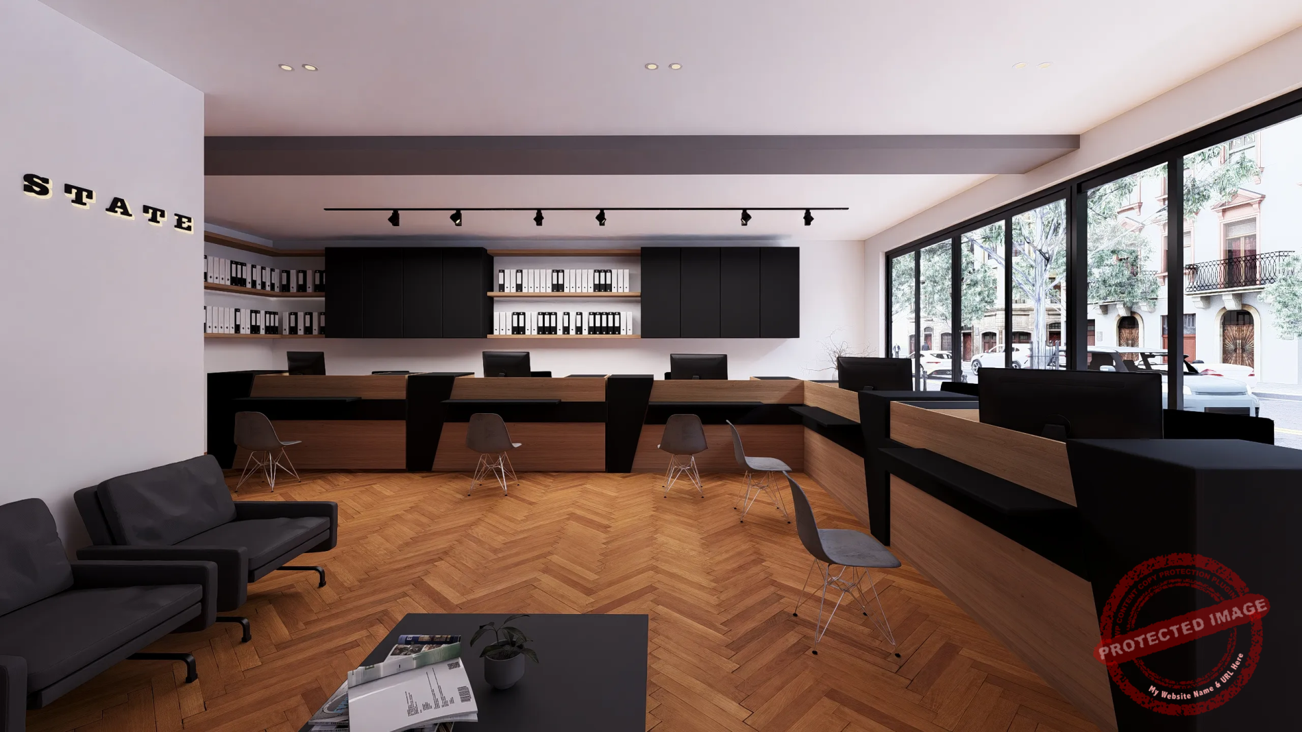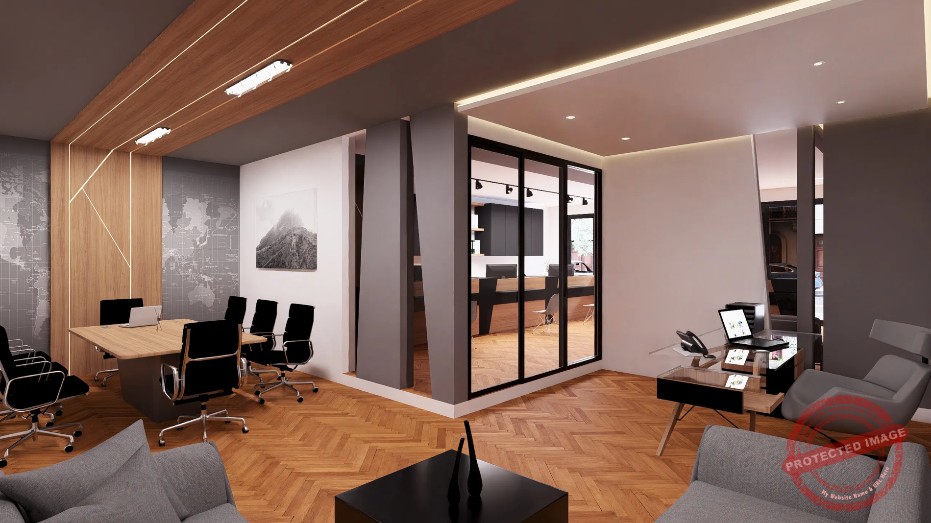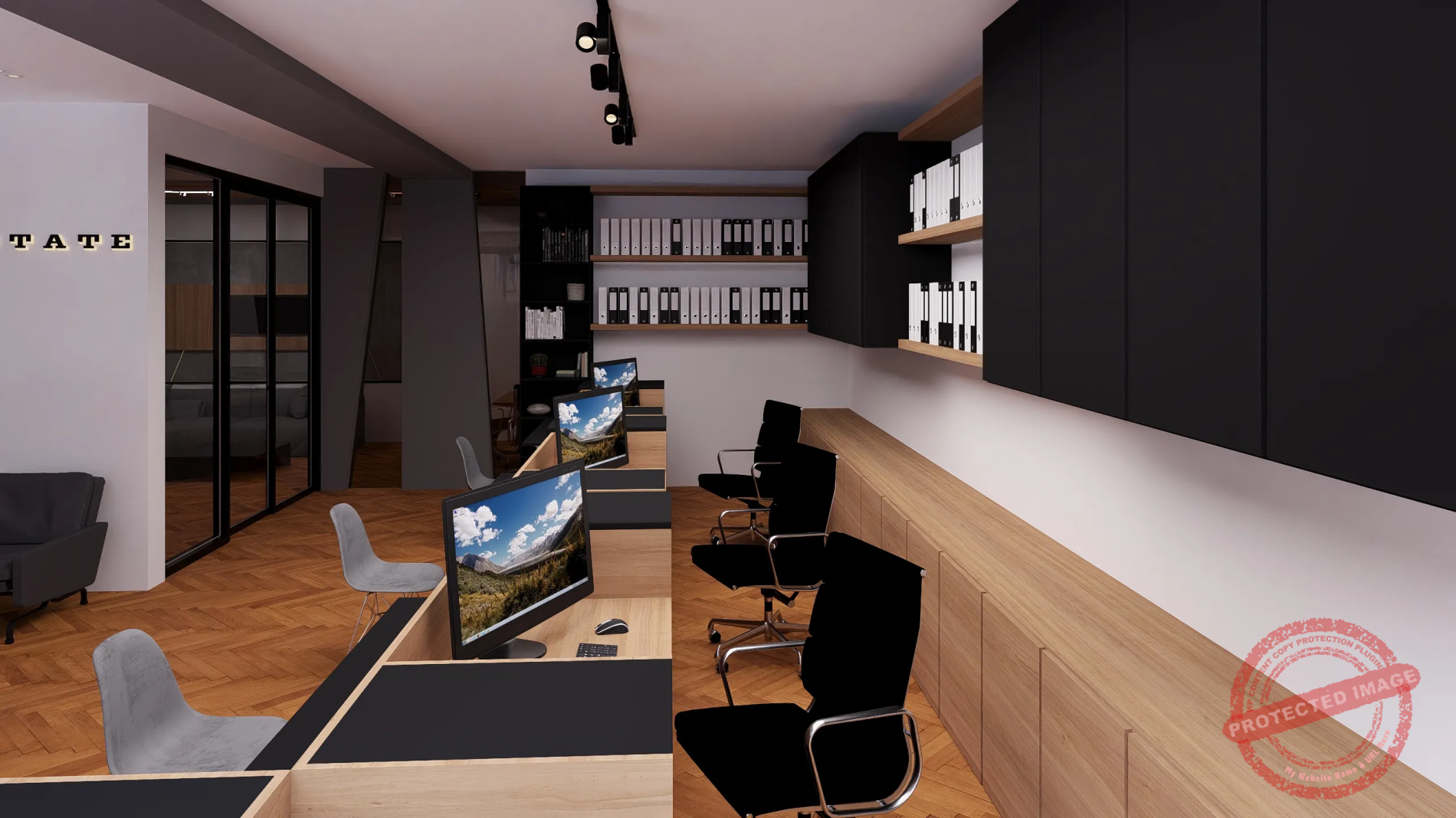 پروژه مذکور طراحی داخلی یک مشاور املاک با سبک مینیمال و مدرن بوده که طبق نظر کارفرما بخش ریاست و اتاق جلسات کاملا از فضای فروش و انتظار تفکیک شده است.